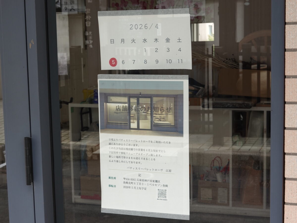 JR摂津本山駅から4分ほど北へ上がった場所にある『パティスリーパレットローヴ』が4月11日で岡本・摂津本山エリアでの営業を終了しています。