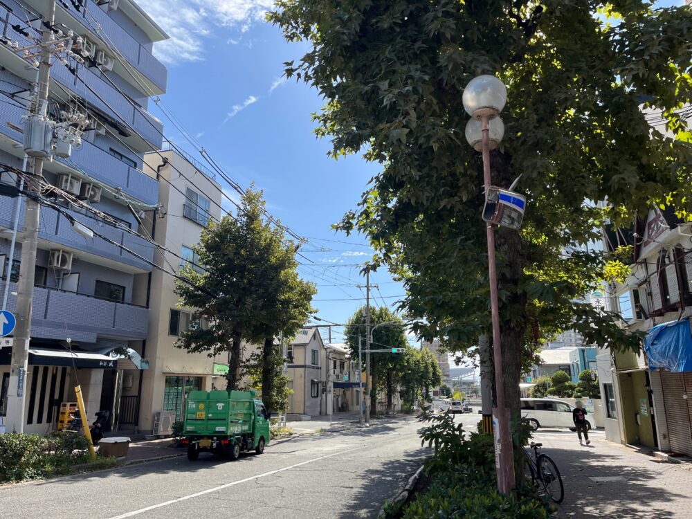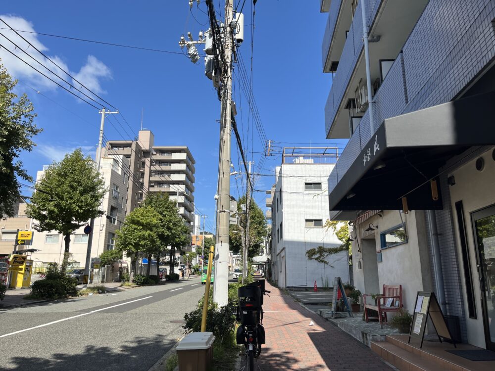 山側を向くとこんな感じ。並びには「Fusee Hair」という美容院があり、さらに進むとスーパーマーケット「ジョイエール月見山」がみえます。山陽 月見山駅まで歩いて4分ほど。