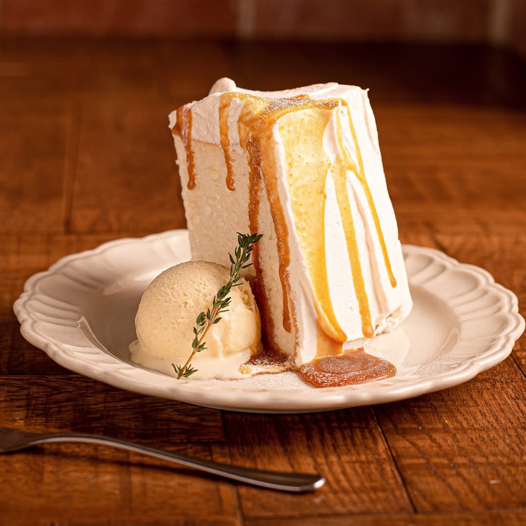 卵白のみで仕上げた生地は驚くほどふわもち食感で、たっぷりの生クリームでコーティングされています。そこにほろ苦い自家製キャラメルソースが絡まると、大人な味わいに。