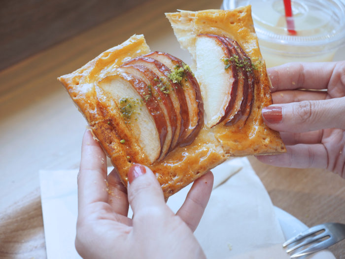 口に入れた瞬間に、まず「サクサク」とした軽い食感と、軽く焦がしたような「バターの香り」を口の中に感じます。上に乗ったりんごは、おばあちゃんが焼いてくれたような懐かしい素朴な「焼きりんご」の味。