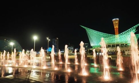 夜のメリケンパークは、BE KOBEモニュメントがライトアップされてますし、噴水広場でも音楽と合わせた演出があったりします。
