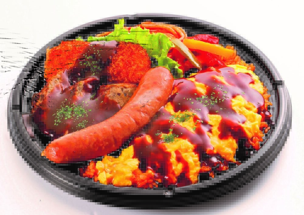 とろとろ卵のオムライスに、ハンバーグ、コロッケ、フランク、スパゲティを贅沢に盛り合わせた、満足感たっぷりの一皿です。濃厚なデミグラスソースとともに、洋食屋のごちそう感を楽しめる、世代を問わず人気のメニューです。