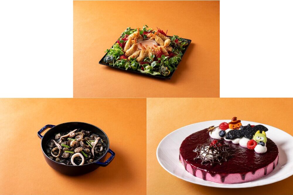 ぷりぷりの海老に細い糸状の生地を巻いてミイラに見立てた「ミイラに巻かれた海老のフリット 赤いタルタルソース添え」や、イカ墨を練りこんだ「真っ黒のシーフードパスタ」、ハロウィンをイメージしてデコレーションした甘酸っぱい「ハロウィンカシスのムース」など、ちょっと不気味で華やかなメニューが用意されています。