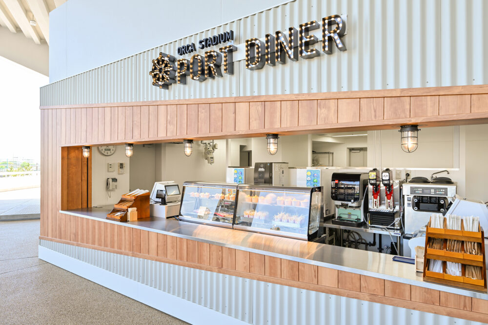 「ポートダイナー オルカスタディアム」は、オルカスタディアムの横にあるテイクアウトショップ。大洋を航海中にひと休みする港をイメージした店舗で、軽食やドリンクを販売しています。