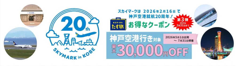 スカイマークが「神戸空港」に就航して20周年ということで、今回のキャンペーンは第3弾みたいです。今後もお得な情報があるかも?気になる人は、公式サイトをチェックしてみてください。