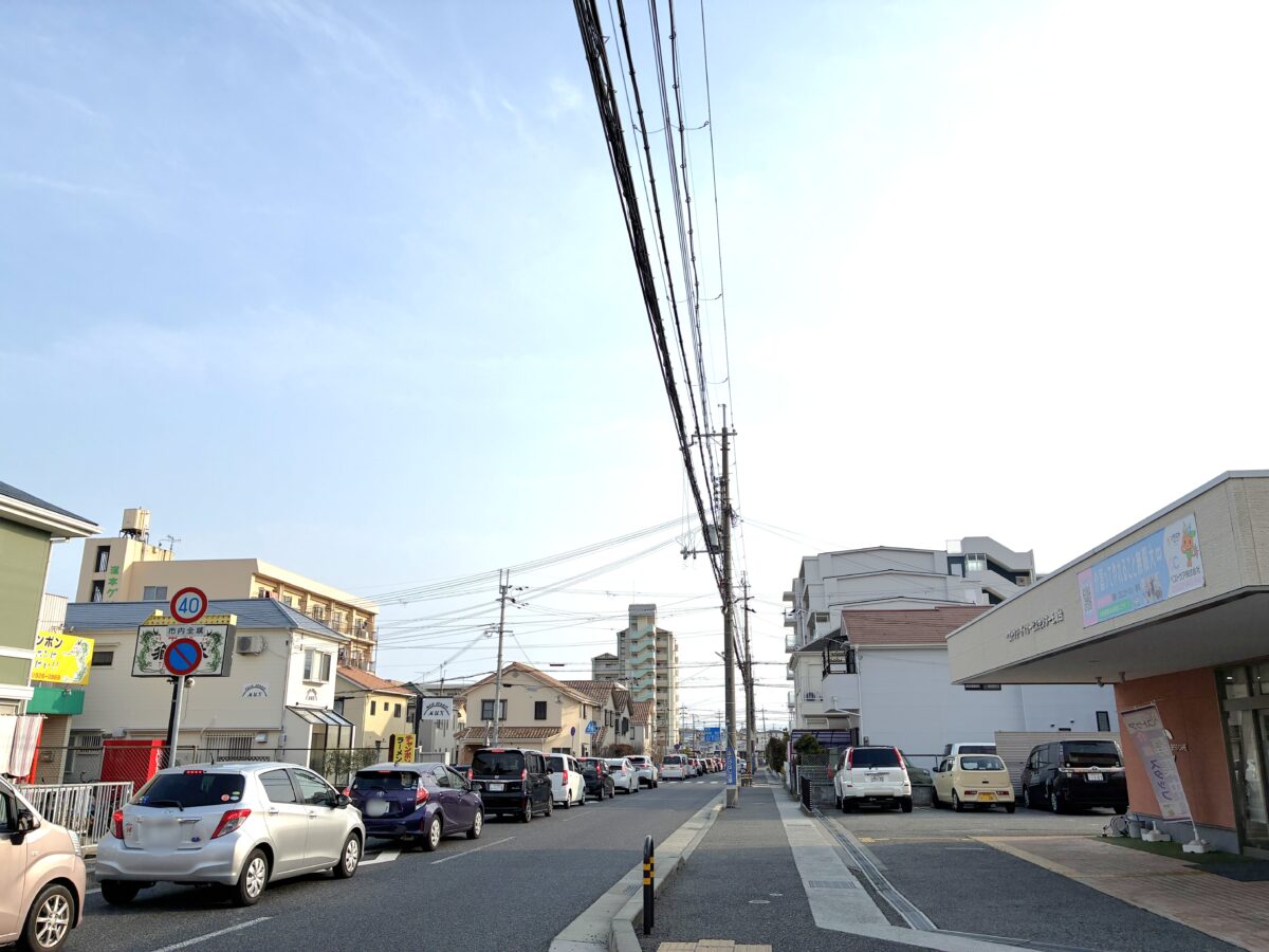反対を向くとこんな感じ。向かいには「ベストケア・デイサービスセンター王塚台」があり、少し進むとスーパーマーケットの「マルアイ」などもあるエリアです。