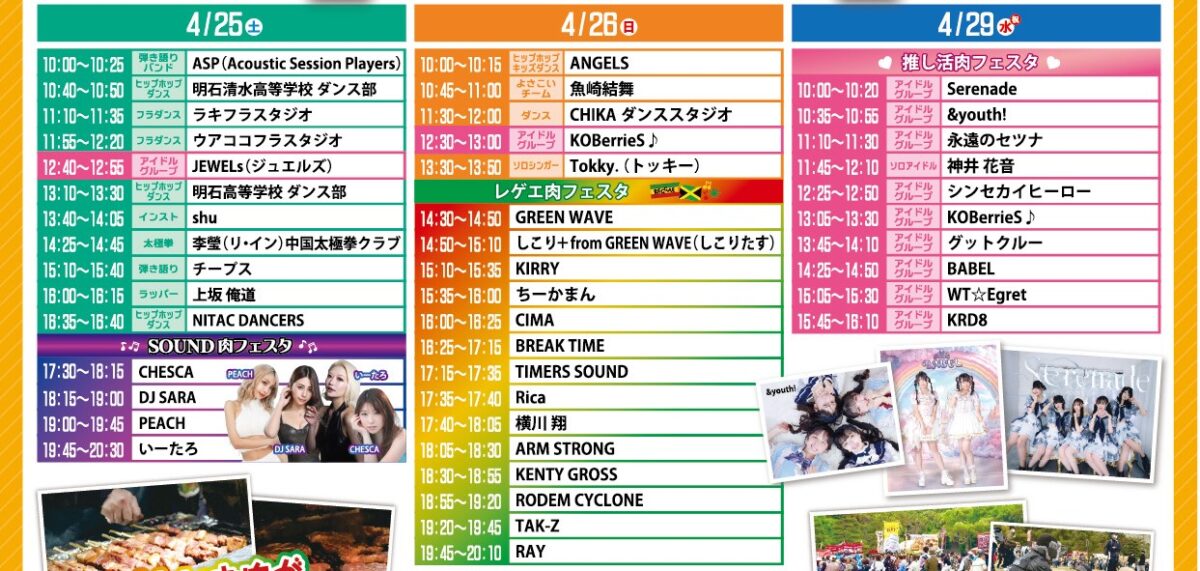 最終日の4月29日(水・祝)は「推し活肉フェスタ」が開催。関西で活躍中のアイドル「グッドクルー」や「KRD8」、「KOBrrieS♪」など、10組が出演しますよ。