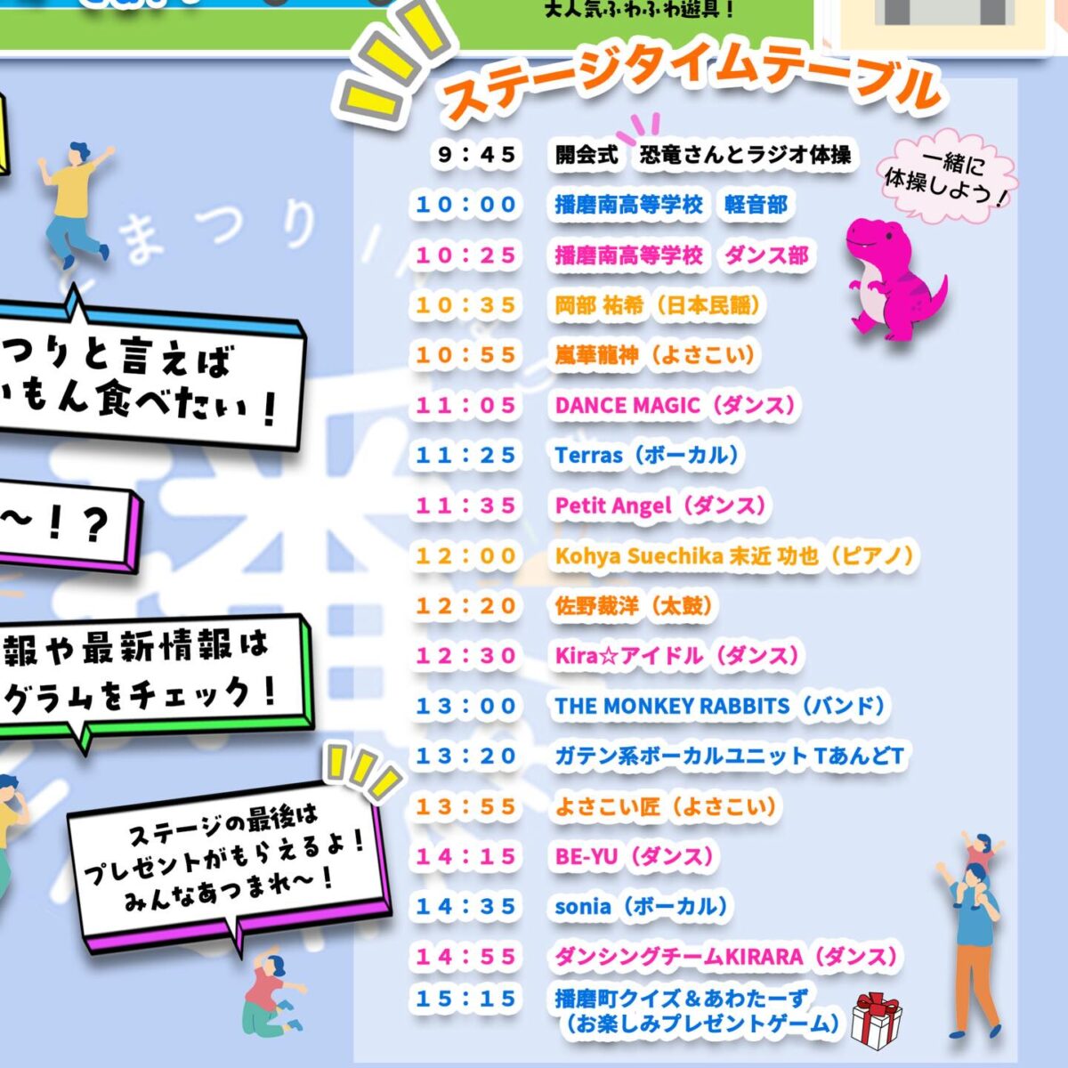ステージでは、歌やダンスのパフォーマンスが多数披露されます。播磨町ふるさとPR大使の岡部祐希さんも登場するそうです。