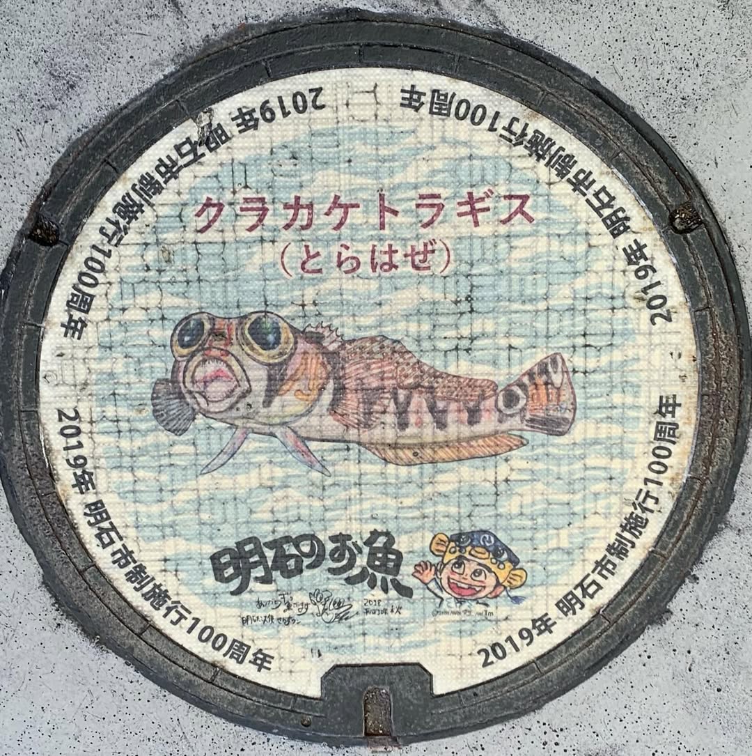 足元を見ると手描きイラストのマンホールが。こちらは明石市が2019年に市制100周年を迎えたことを記念して、タレントの「さかなクン」によって描き下ろされたものなんです。