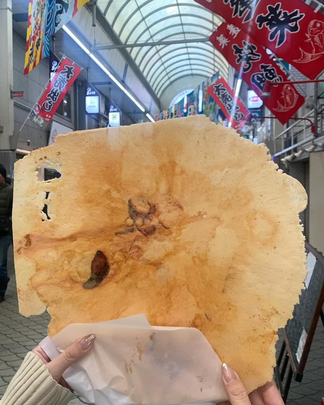 顔よりも大きなサイズのせんべいはインパクト大で、SNSでも話題の商品なんだとか。