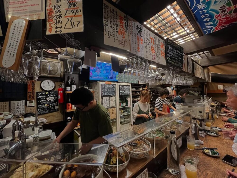 「たなか酒店」の左側にある扉をくぐると、中には落ち着いた雰囲気の立ち飲み屋さんが出現。こちらもオープン前に行列ができるほどの人気店です。