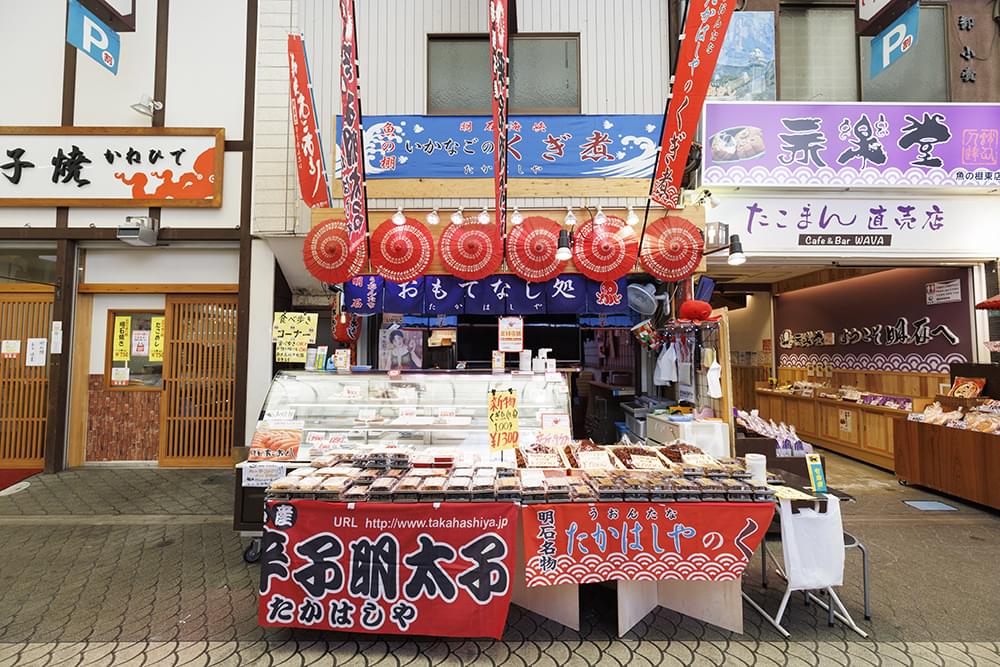 全長350m続くアーケードには、明石の海産物や練りもの、乾物などを扱う商店を中心として約110の店舗が建ち並んでます。