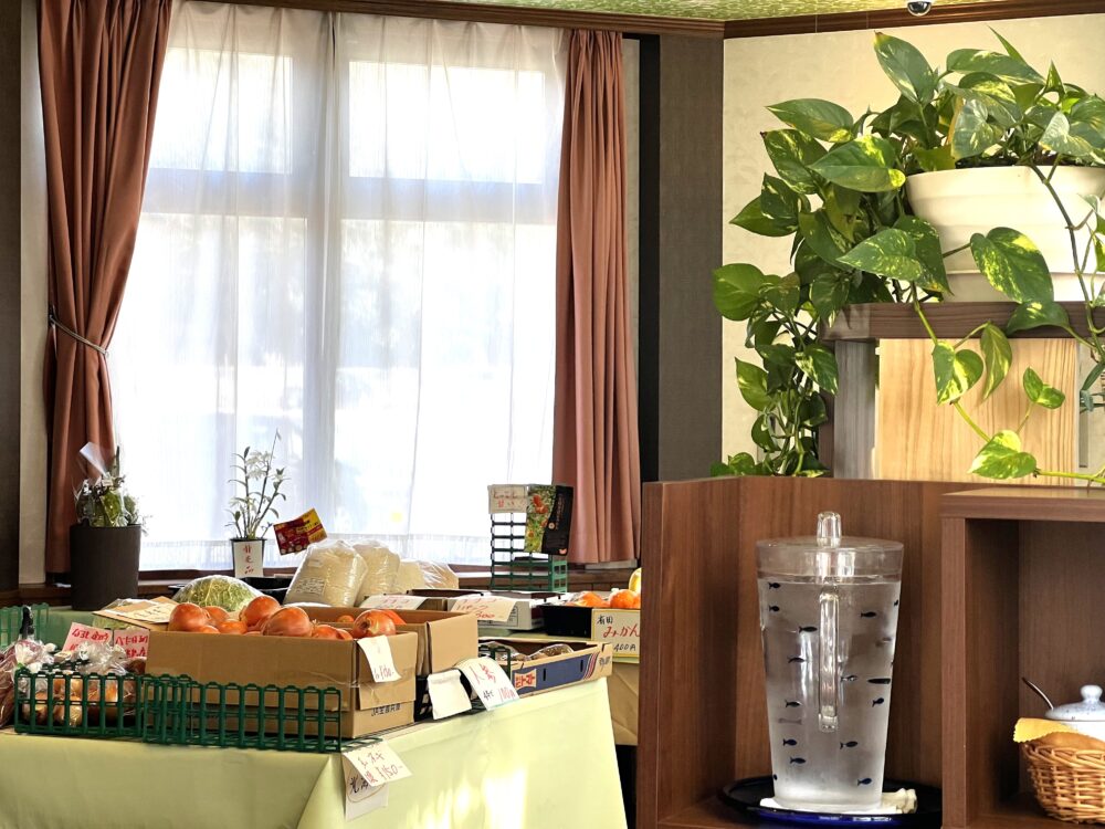 営業再開後は、以前まで客席が設けられていた一画に野菜コーナーが設けられ、近隣で採れた野菜や果物が販売されています。