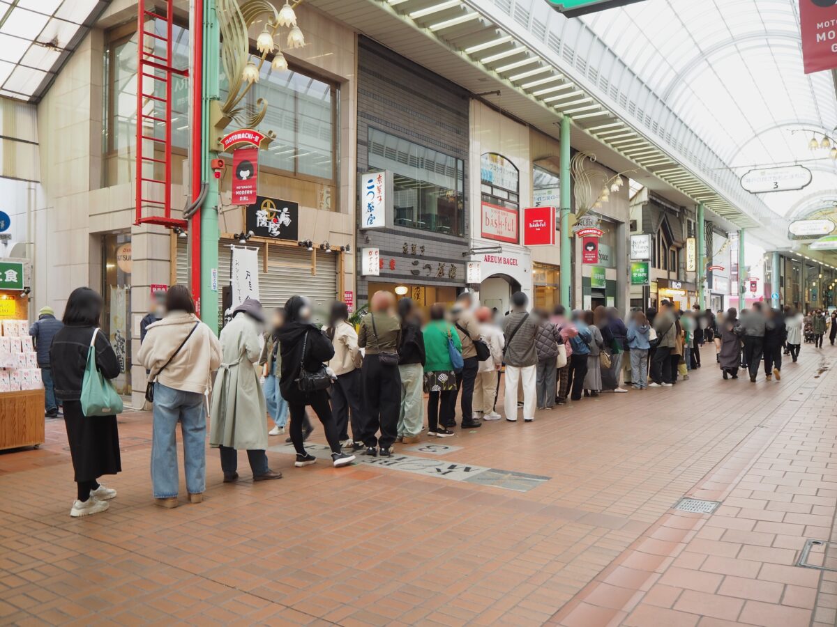 お店がオープンしたのは2月25日(水)。少し経った今も、開店前から行列ができていました。このあとも続々と人が増えて、商店街の中に長蛇の列が。