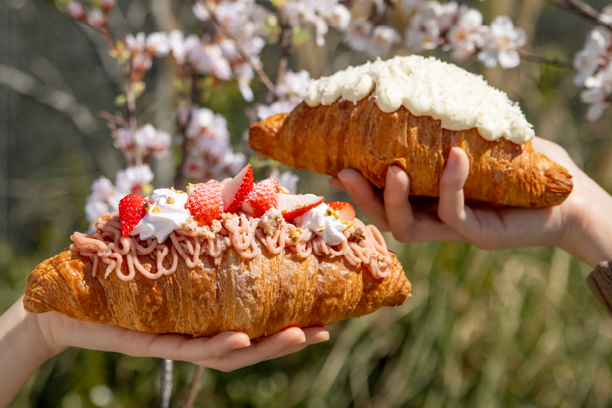 お花見のおともに、サクサク食感のクロワッサンに甘いクリームをたっぷりとのせたクロワッサンスイーツが提供されます。お得なドリンクセットもあるそう。