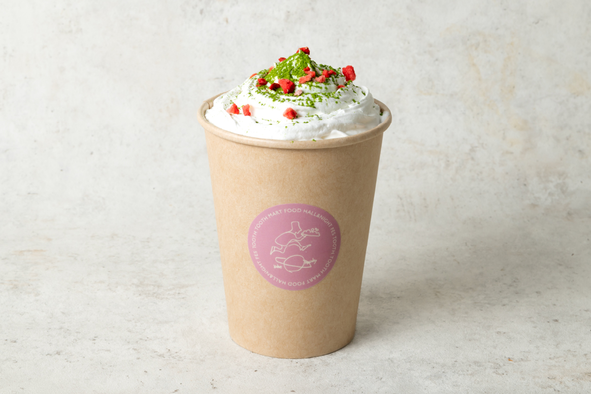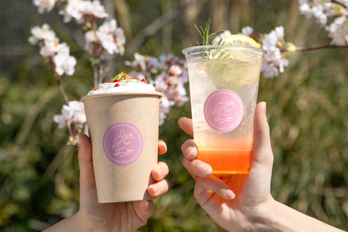 ピンク色のロゴが可愛いスイーツドリンクは、鮮やかな桜色のレモネードとホッとあたたまる抹茶オレの2種類。桜をバックに手に取って写真を撮るのもおすすめなんだそう。