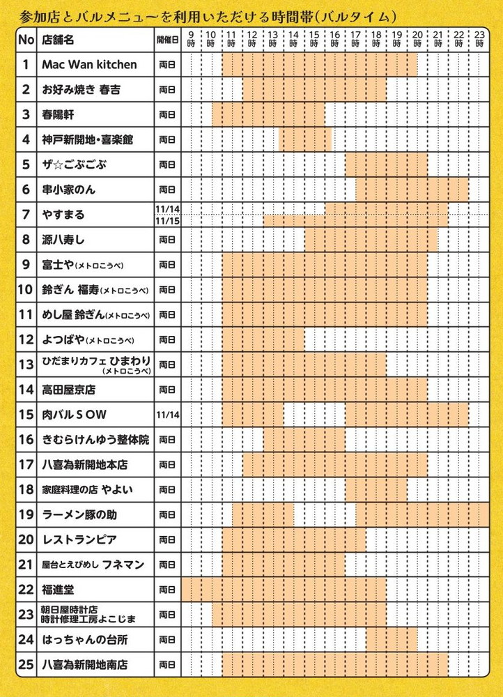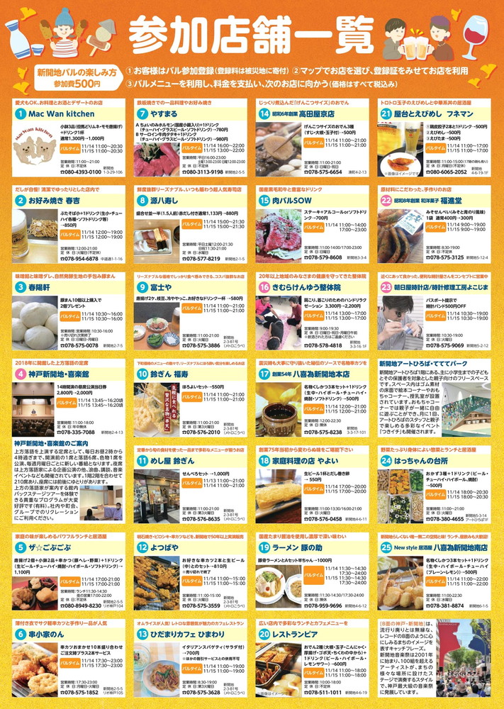 対象店舗は、新開地商店街周辺~メトロこうべの25店舗。それぞれのお店で、フードやドリンクが「特別価格」になったり「特別メニュー」が用意されたりしています。