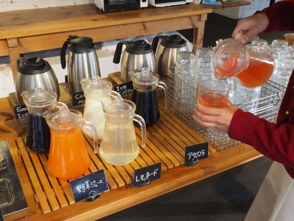 ドリンクは珈琲(H/I)・紅茶(H/I)のほか、野菜ジュース・レモネード・アセロラなどのジュース類もあわせて全10種類。牛乳もあるのでカフェオレ・ミルクティーも自分好みの濃さで作れますよ。