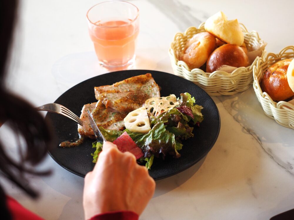 サラダがワンプレートで盛られていて、女性でも無理なく食べられるボリューム感。粒マスタードやハーブが入ったソースが食欲をそそり、パンもたっぷりと楽しめそうです。