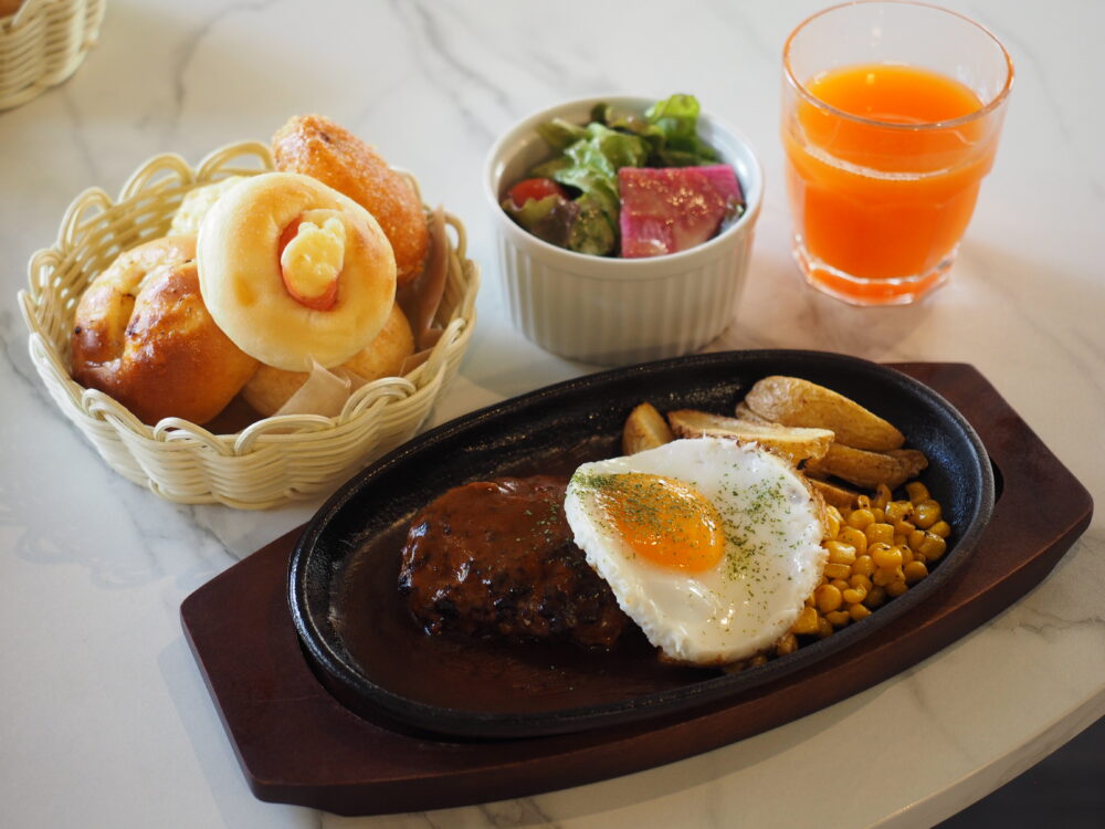 ハンバーグにはたっぷりのデミグラスソースがかかっていて、甘めのコーンとホクホクのポテトもたっぷり。小さめのサラダもセットです。