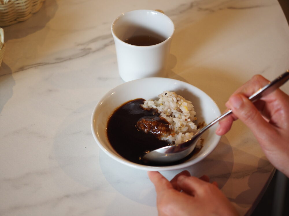 お腹に余力があれば「ブラックカレー」も。サラッとして食べやすく、甘いパンと交互に食べればいつまでも食べられそう」とまやこさん。