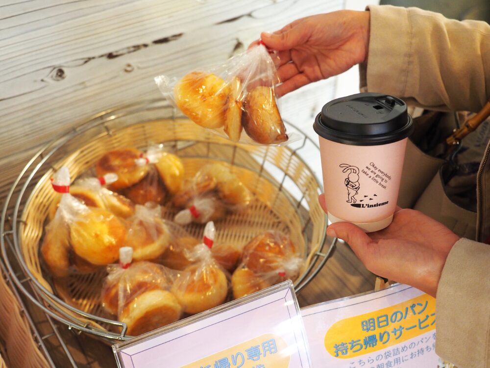 フードロスに配慮した取り組みとして、帰りに「ブッフェで余ったパン」と「お好きなドリンク」を持ち帰ることができます。