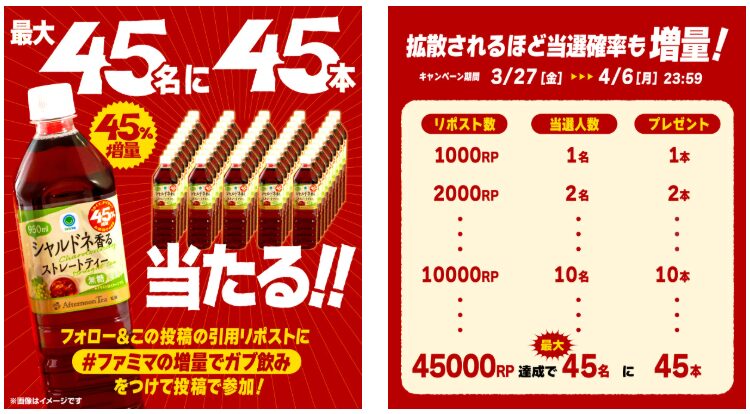 ファミリーマート公式X(@famima_now)をフォローのうえ、対象の投稿に指定のハッシュタグをつけて引用ポストすると、「Afternoon Tea監修 シャルドネ香るストレートティー 950ml」が当たります。対象投稿のリポスト数に応じて当選人数が最大45名、プレゼント本数は45本になります。