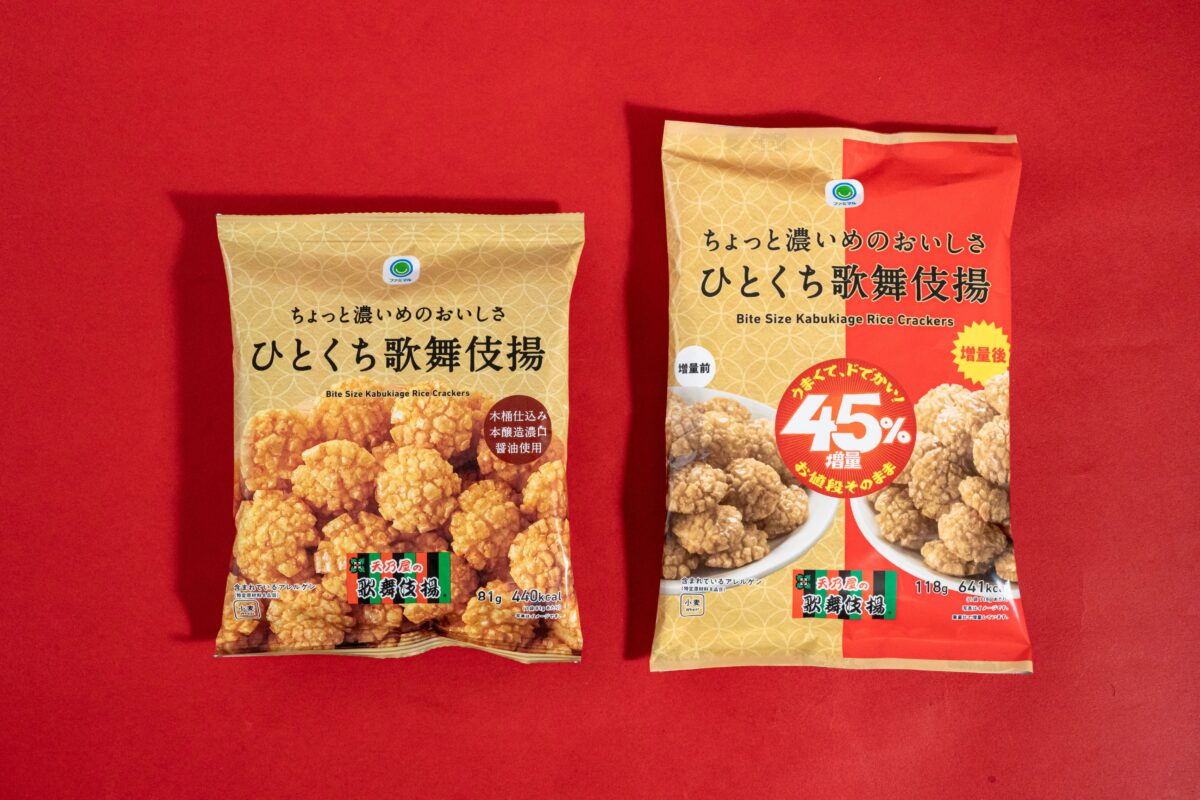 サクッと揚げたひとくちサイズのお煎餅を、濃厚でコクのある甘口醤油で味付けした歌舞伎揚が“なぜか45%”増量されています。
