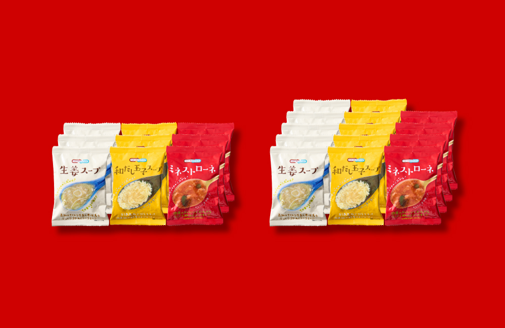 生姜スープには高知県産生姜や九州産銘柄鶏「華味鳥」を使用するなど、味だけでなく素材にもこだわったフリーズドライスープです。内容数(入数)が“なぜか45%”増量。
