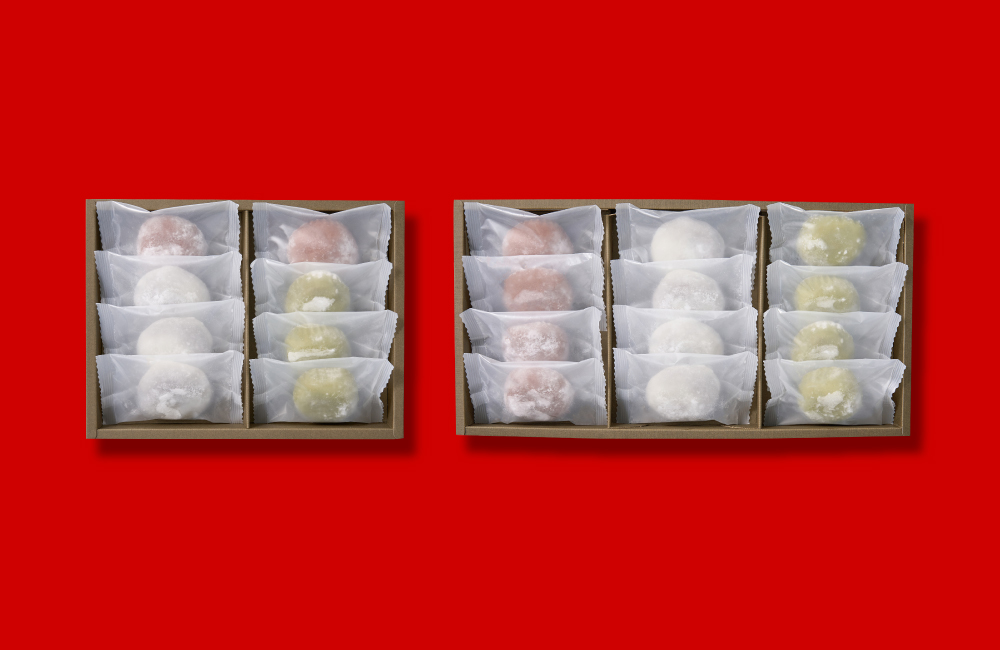 コーヒー餡を使ったカフェオレ大福、福岡の八女茶をもち生地、クリームに使用した抹茶クリーム大福、香り高いココアを使用したショコラクリーム大福をセットにしました。個数を“なぜか45%”増量しました。