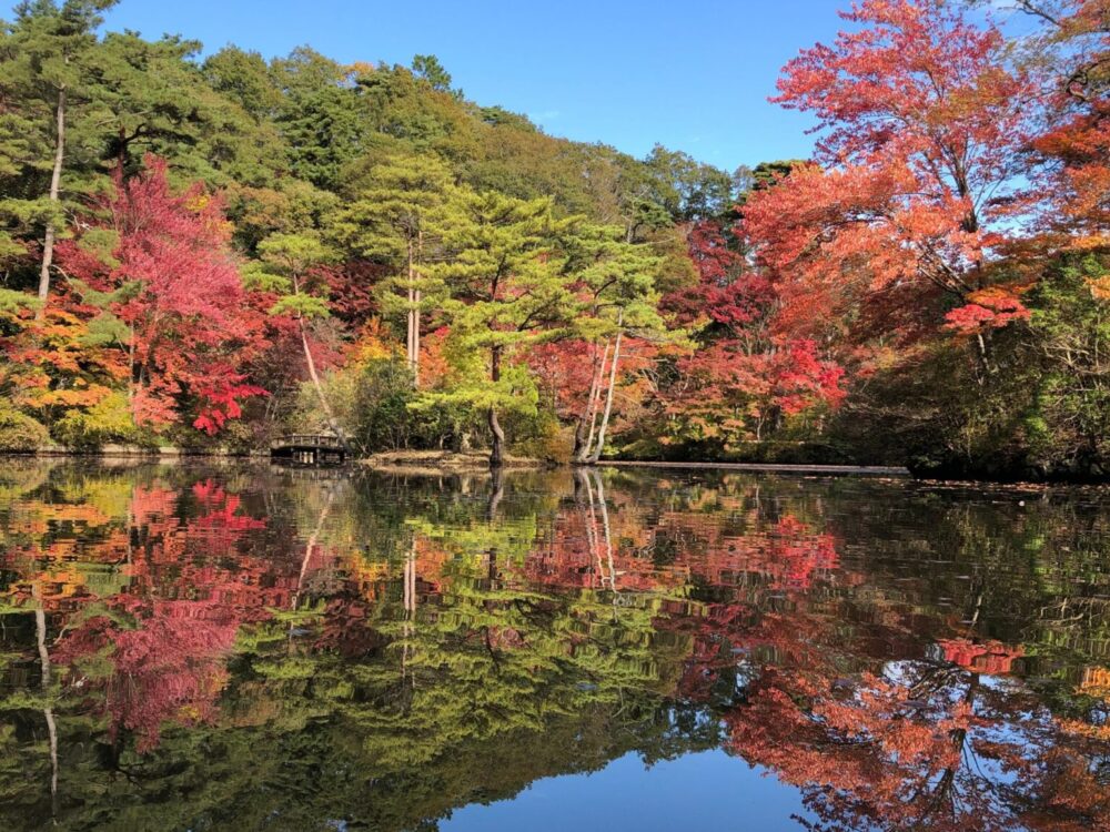 公園の中心には「修法ケ原池(しおがはらいけ)」があり、水面に映る紅葉が楽しめます。