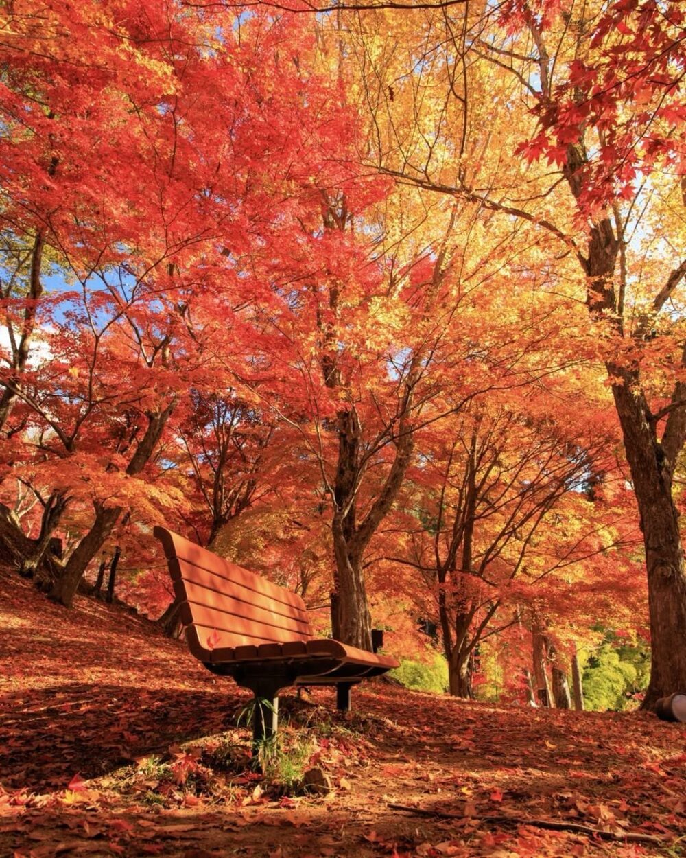 ベンチに座りながら、一面紅葉に彩られた山景色をゆっくり堪能してみてはいかがでしょうか。