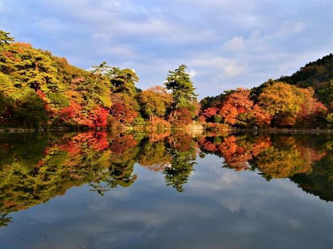 例年11月中旬から下旬にかけての紅葉は、山全体が燃えるように美しく染まります。ゆっくり探索できる遊歩道や弁天池が近くにあり、憩いの場にもなっているんだそう。
