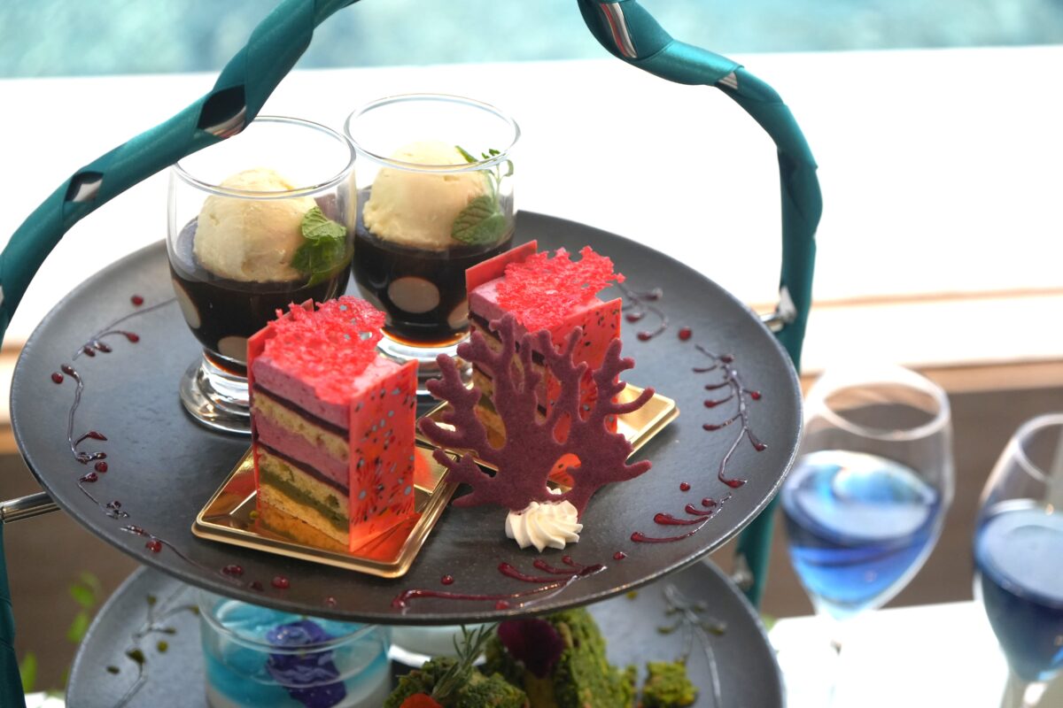 ティースタンドの上段には、アトア3F『FOYER-探求の室』で出会えるエイ「ポルカドットスティングレイ」をモチーフにしたコーヒーゼリーや、同フロア『MIYABI-和と灯の間』の風光明媚な和の世界からインスピレーションを得たさくらんぼのケーキが並びます。