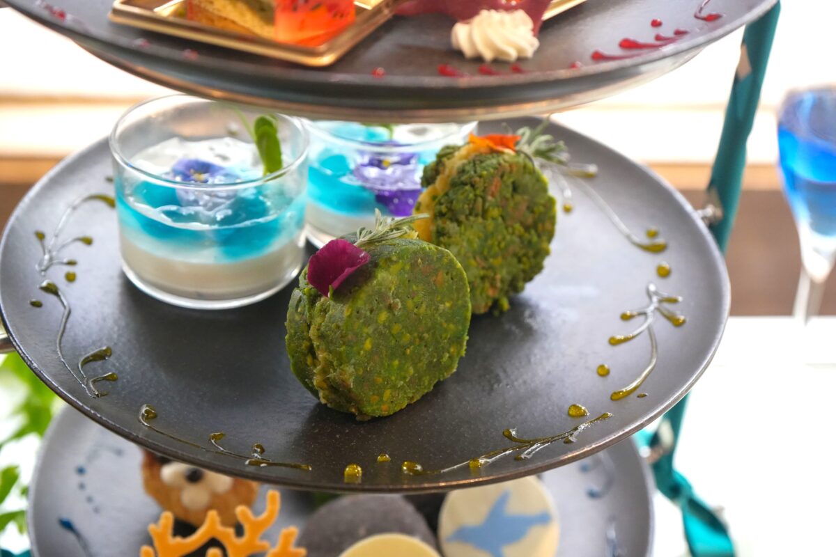 その世界観をもとにホテルシェフが考案した4種類のセイボリーを取り揃えました。海に潜むカラフルな生きものたちをイメージしたアクアリウムサラダや、象徴的なフォルムのビーツ風味のラングドシャを飾ったスモークサーモンサンドなど、ほど良い塩味がアクセントのラインナップです。