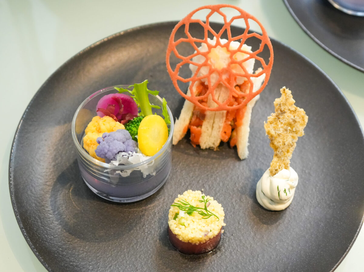 【別皿】スモークサーモンサンド ビーツ香るラングドシャ飾り/花野菜のアクアリウムサラダ/マグロのタルタルとクスクスのガトー仕立て/海苔のガレット ディル香るクリームチーズ添え