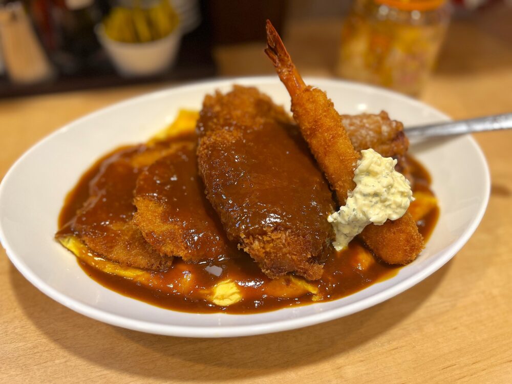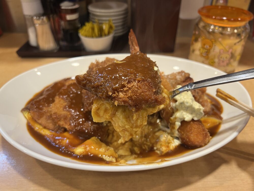今回は「スーパーボルガライス(1,700円)」を注文。チーズ入りオムライスの上にミンチカツ・エビフライ・唐揚げなど全部で5つのフライが盛々にトッピングされています。