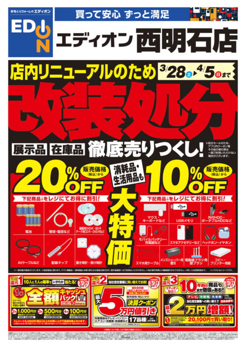 最大20%引きの商品も。「エディオン 西明石店」が改装前の『売りつくしセール』を開催しているみたい