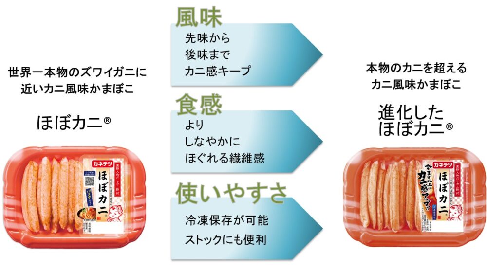 「ひと口目から一瞬で広がるカニの香りと風味」はそのままに「カニの風味の持続性」と「より本物に近い食感」を徹底的に追求。