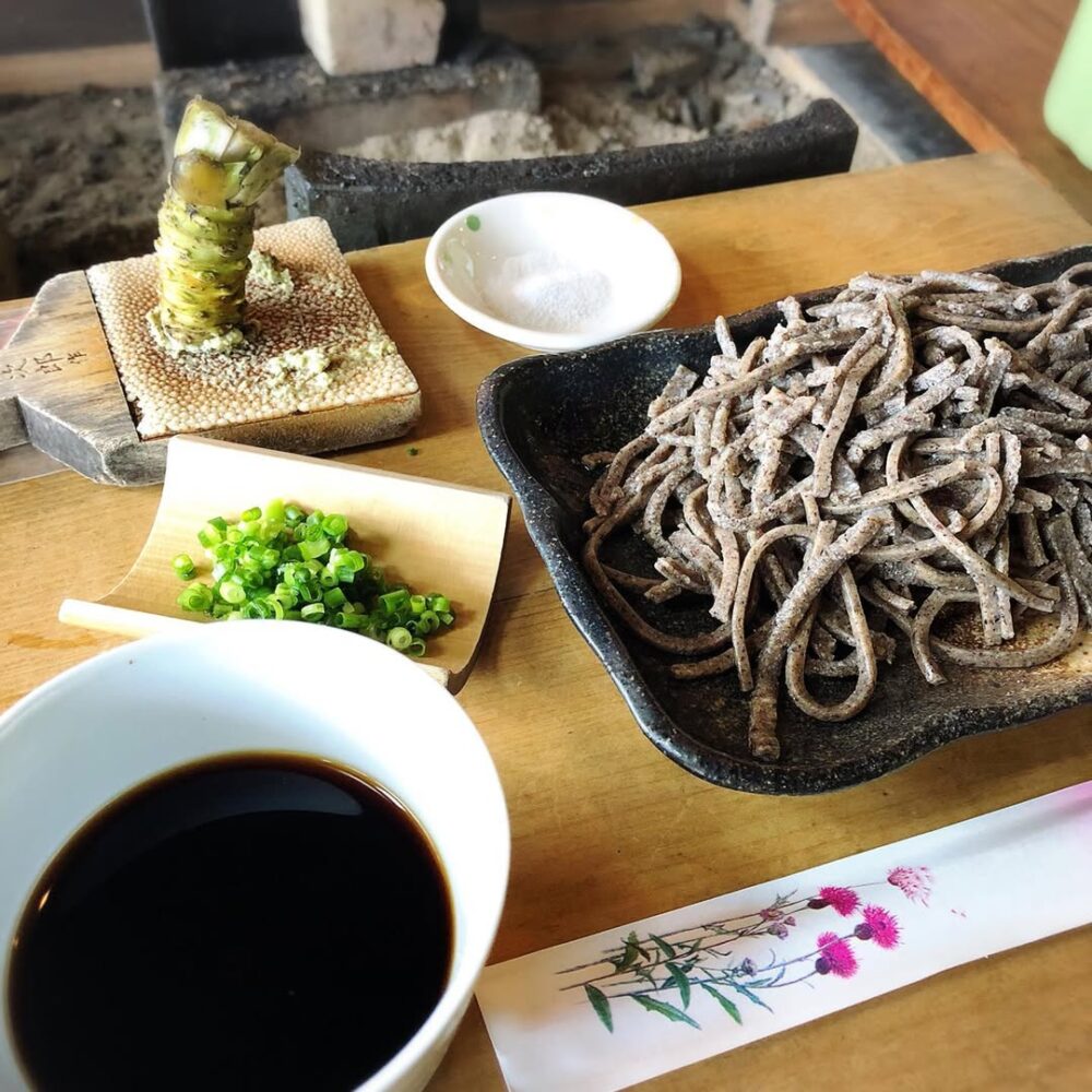 お店の名前にもある「十割そば」のほか、囲炉裏席で調理しながらキジ肉・イノシシ肉などの炭火焼や鍋料理も味わえます。
