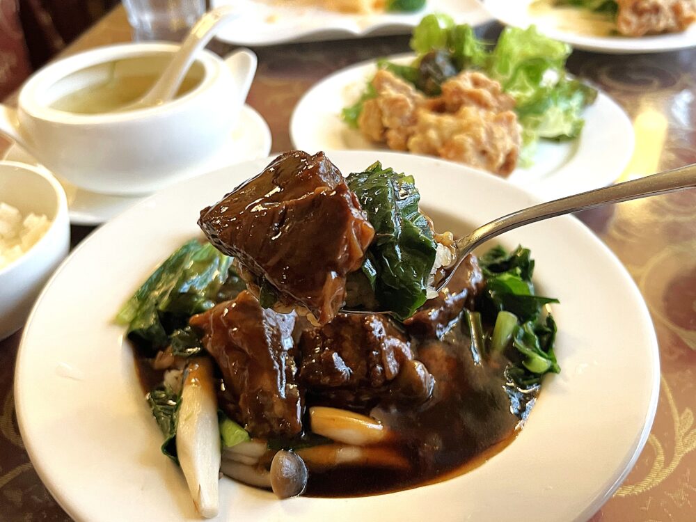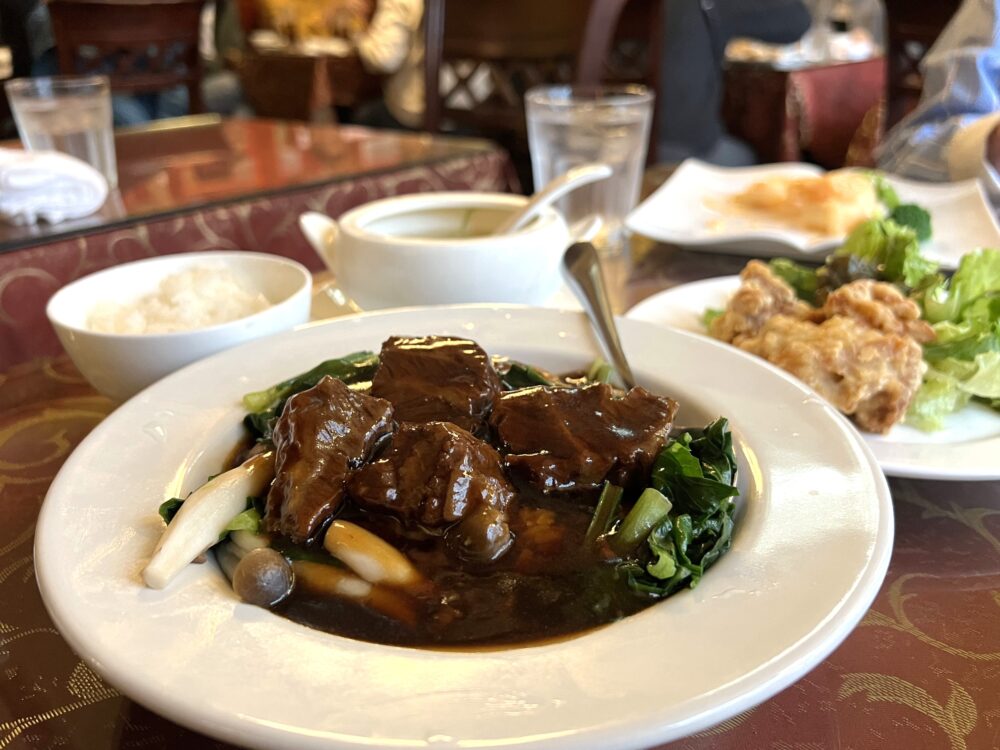 今回は「牛ほほ肉のあんかけご飯セット(1,300円)」を注文。ゴロゴロと大きく柔らかい牛ほほ肉やきのこ類・野菜があんかけに絡んでライスの上にたっぷりかかっています。