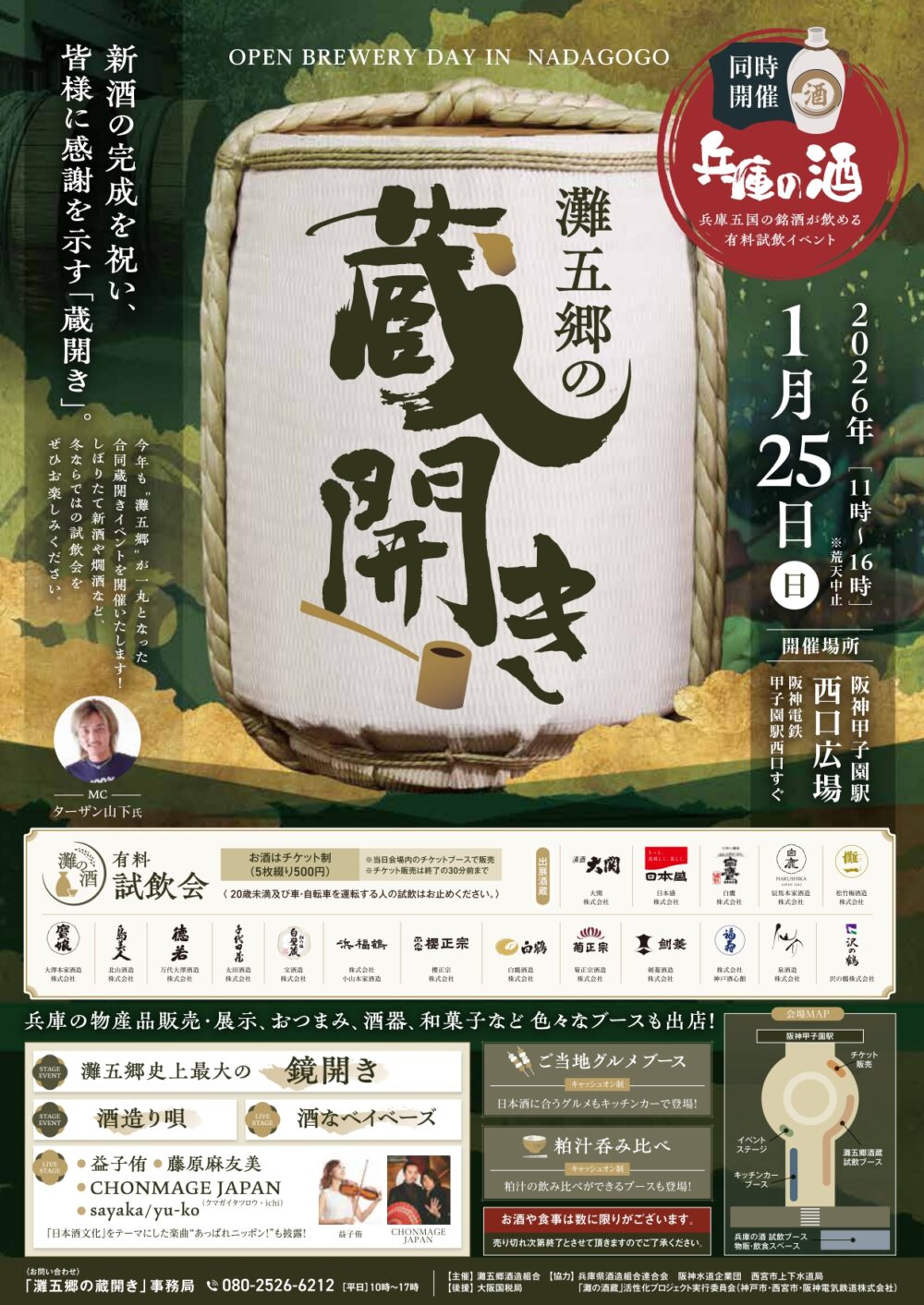 ステージイベントも複数企画されていて、灘五郷では史上最多人数で行う「鏡開き」や「酒造り唄」の披露、酒蔵の有志メンバーで結成された「酒なベイベーズ」によるライブステージなどが楽しめます。MCはラジオMCなどで活躍する「ターザン山下」さん。