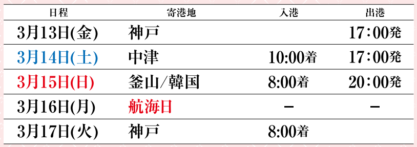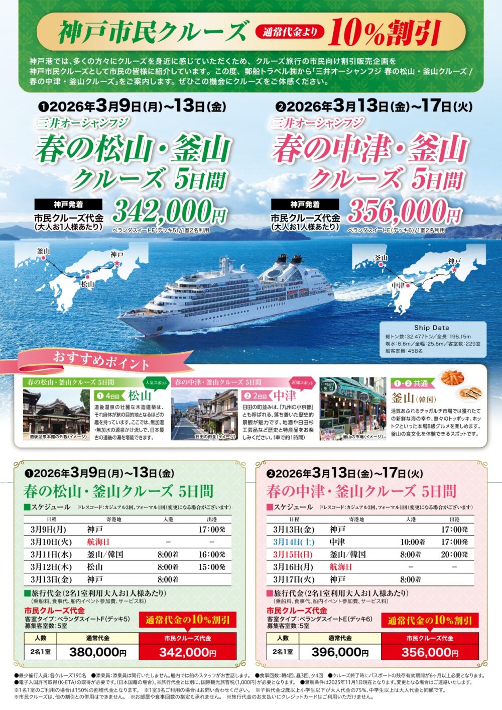 今回募集されているのは、「三井オーシャンフジ」で行く3月出航の「春の松山・釜山クルーズ」と「春の中津・釜山クルーズ」の2種類です。