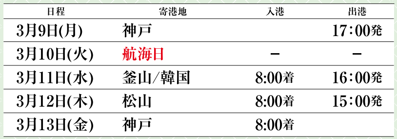 四国や九州を経由して釜山まで行ける5日間のクルージング。クルーズ船やプランの詳細は公式サイトからご確認ください。