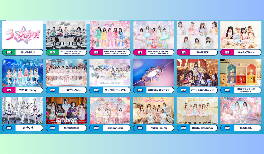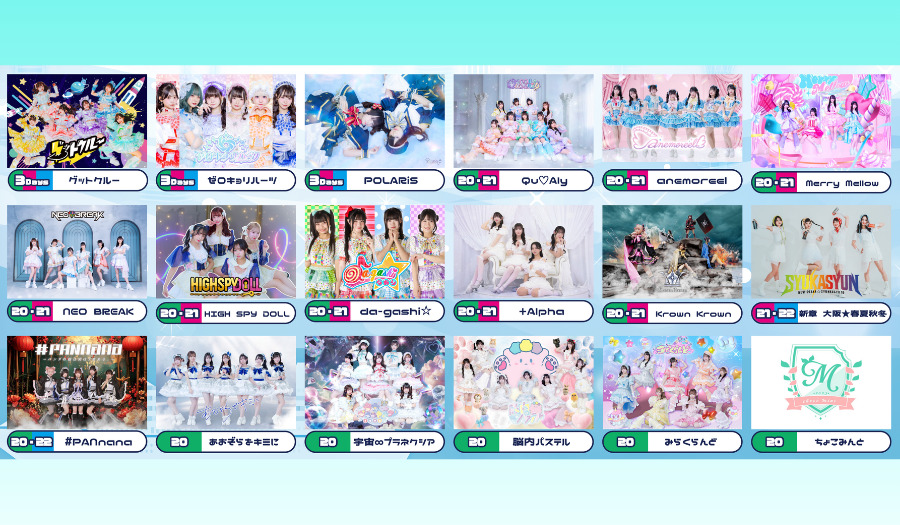 【1日目】グットクルー/ゼロキョリハーツ/POLARiS/Qu♡Aly/anemoreel/Merry Mellow/NEO BREAK/HIGH SPY DOLL/da-gashi☆/+Alpha/Krown Krown/#PANnana/あおぞらをキミに/宇宙∞プラネクシア/脳内パステル/みらくらんど/ちょこみんと/うぃるめり!/Hi-Fi GIRLs PROJECT osaka Fleur