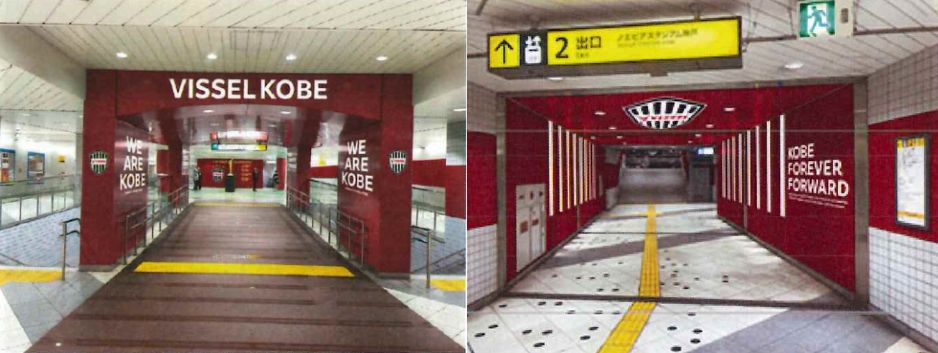 Jリーグのサッカーチーム「ヴィッセル神戸」の本拠地であるノエビアスタジアム神戸の最寄り駅、地下鉄海岸線「御崎公園駅」が装飾を新たにしています。