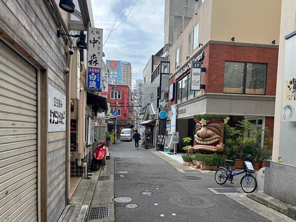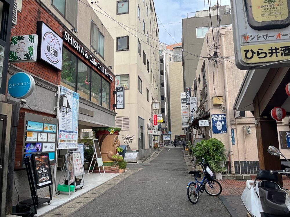 東側を向くと、このような感じ。このまま進むと、「カラオケ館北野坂店」や「セカンドストリート神戸三宮店」があるあたりです。