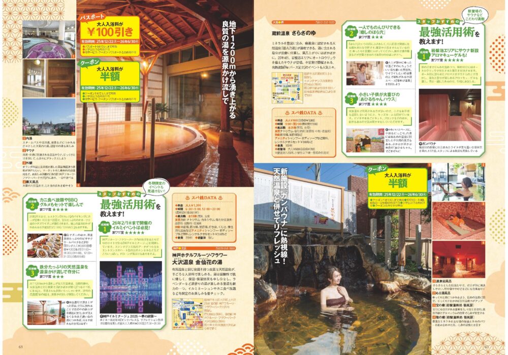 ニューオープン施設の体験レポートをはじめ、期間中何度もサービスが受けられるお得なパスポートや入浴料・岩盤浴などが割引になるクーポンが満載された一冊です。