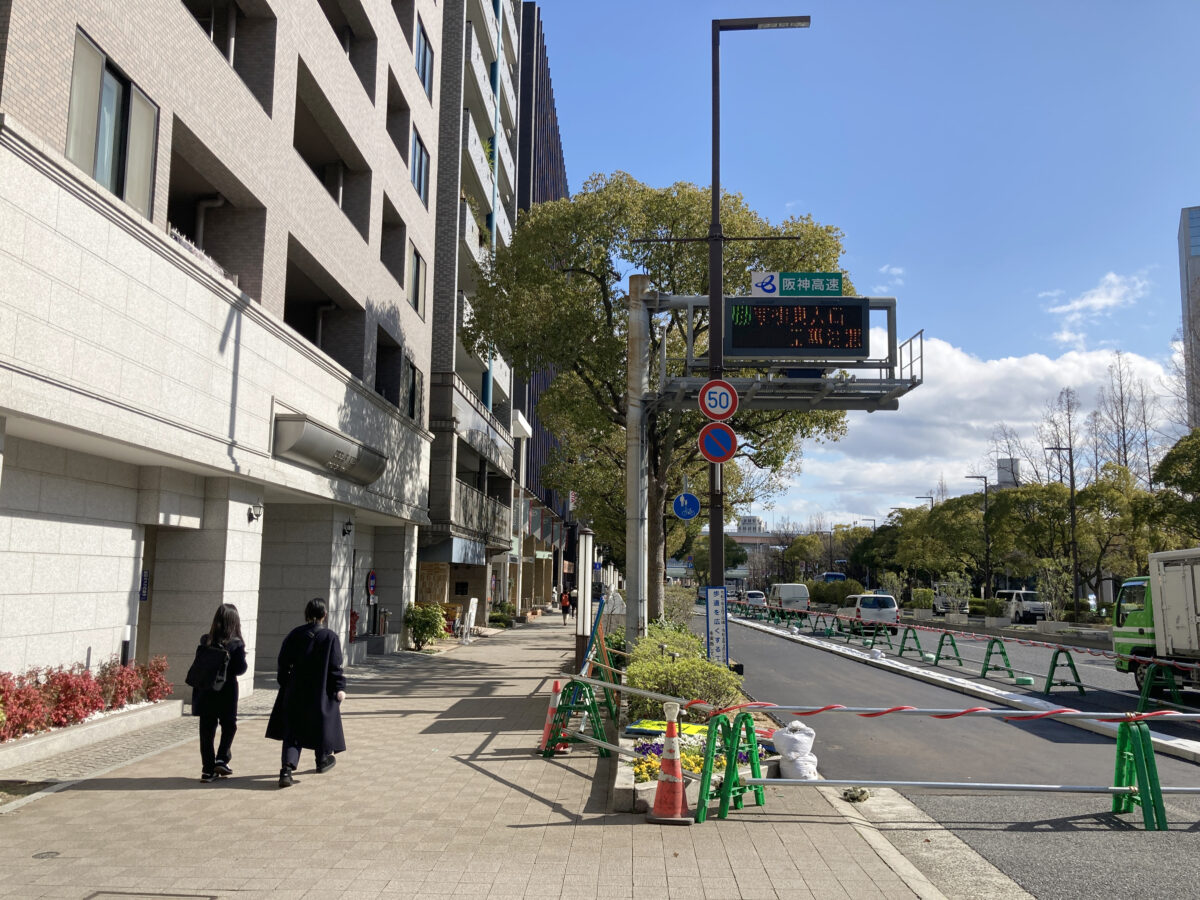 今回様子を見に行ったのは、「国際会館前交差点」から「税関本庁前交差点」までの区間で、車道を減らし「歩道」を広げたり、「自転車道」を整備するという工事。