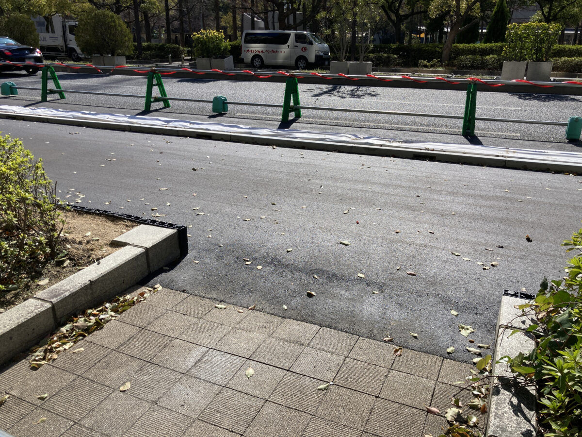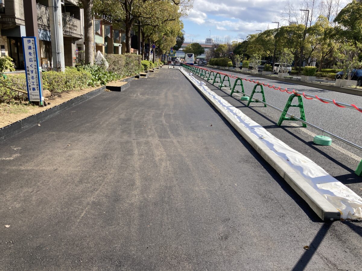 ここは、国際会館から350mほど海側へ行った歩道部分。もともとの歩道と同じくらいの幅で、車道が減らされ縁石で区切られているのがわかります。